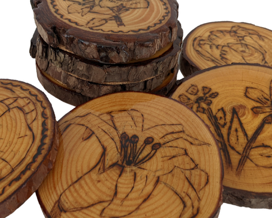 Handcrafted Wood Burned Flower Coasters